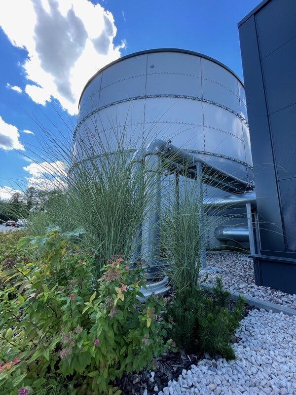 Det är möjligt att anpassa färgen på tanken till omgivande byggnader genom att pulverlackera tankens yta eller täcka tankskalet med trapetsformad plåt i vald RAL-färg.